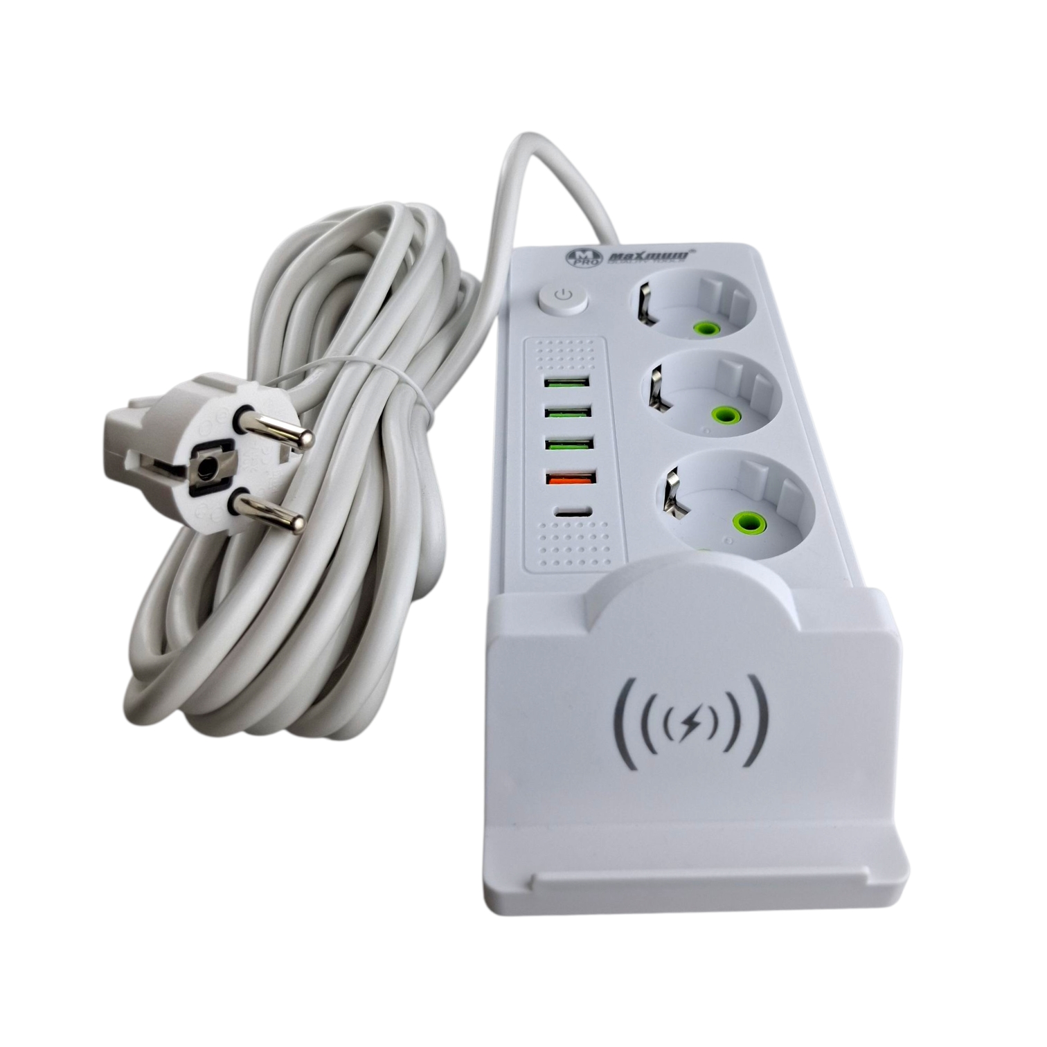 Удлинитель сетевой белый с безпроводной зарядкой 3 метра, 3 евро розетки, 4 USB порта, Type C, 2500W