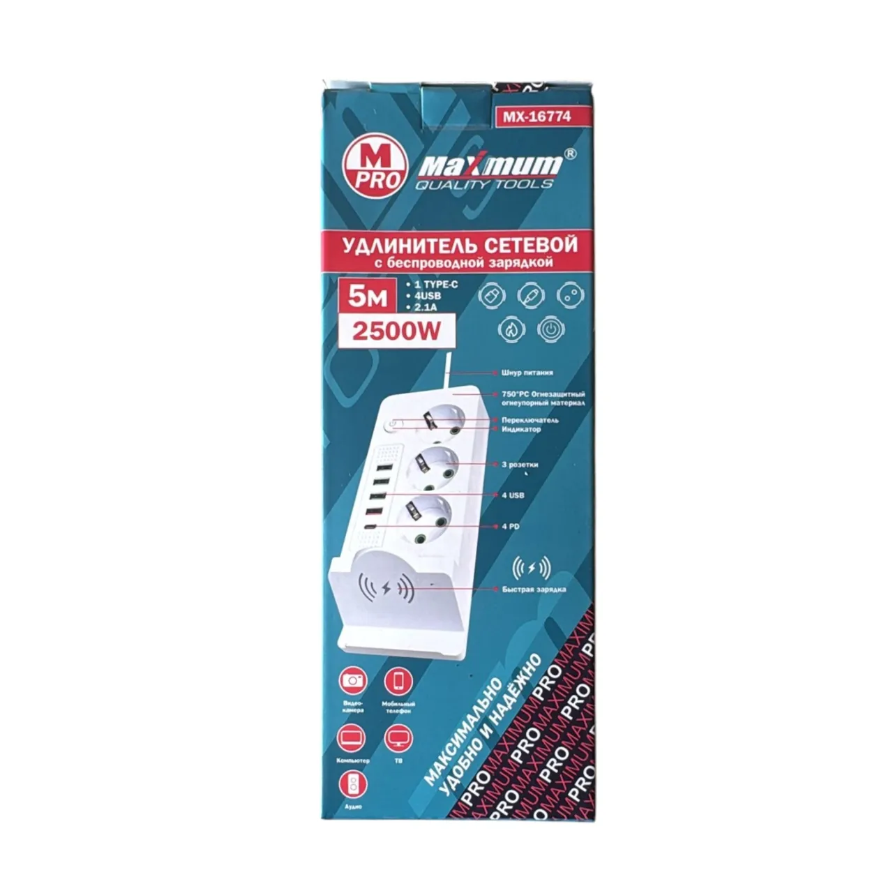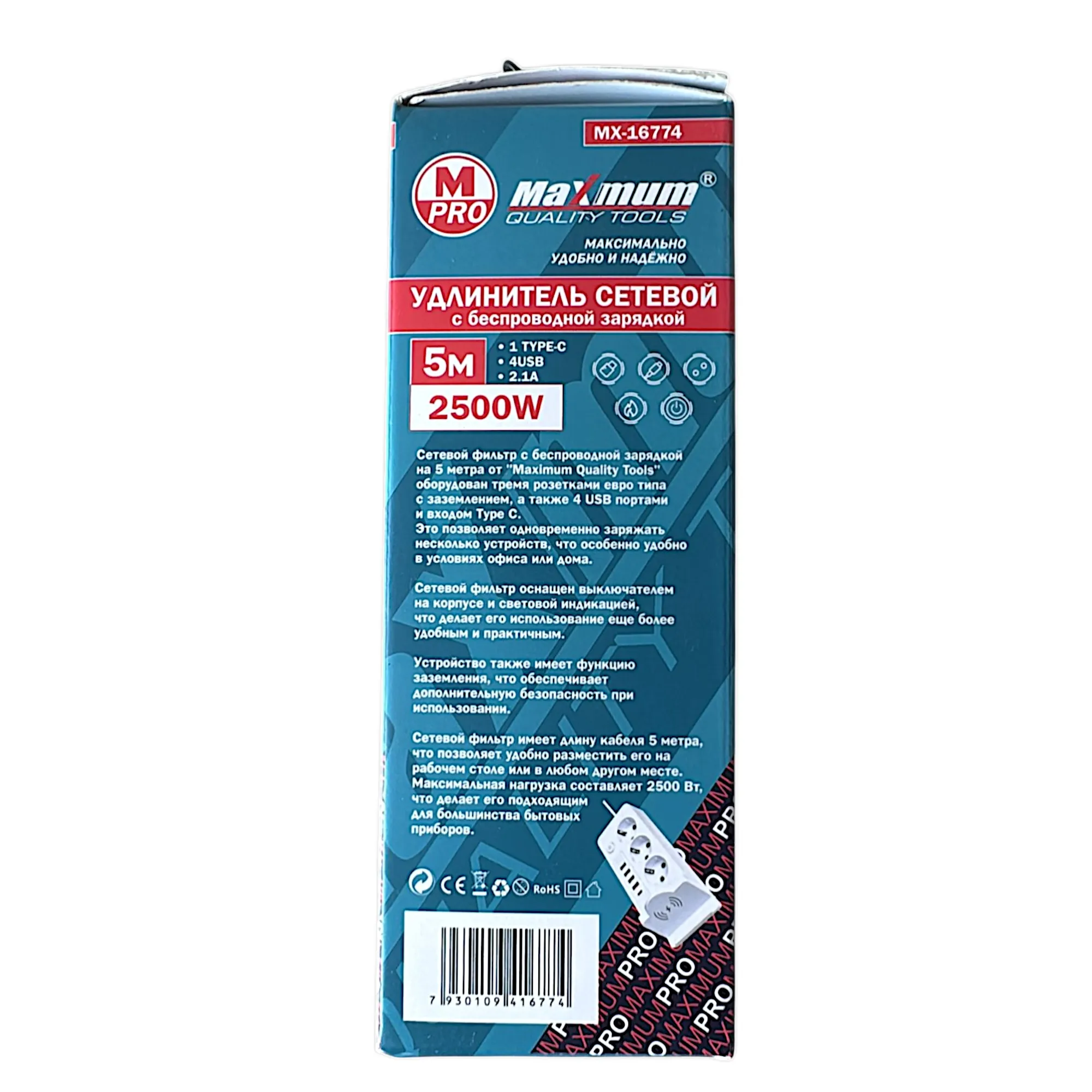 Удлинитель электрический с беспроводной зарядкой 5 метров от "Maximum Quality Tools" оборудован тремя розетками евро типа с заземлением, а также 4 USB портами и входом Type C.