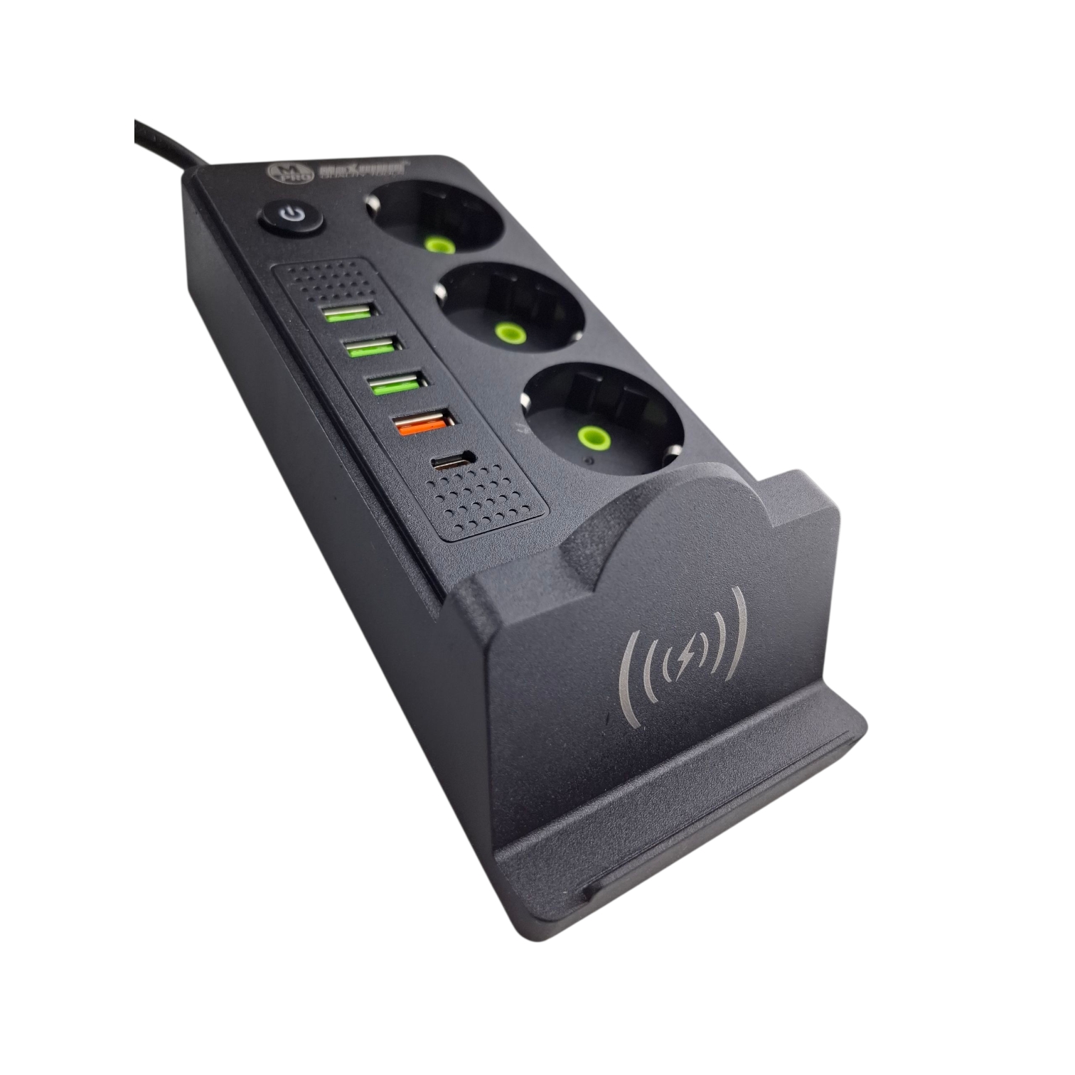 Удлинитель сетевой черный с беспроводной зарядкой 5 метров, 3 евро розетки, 4 USB порта, Type C, 250