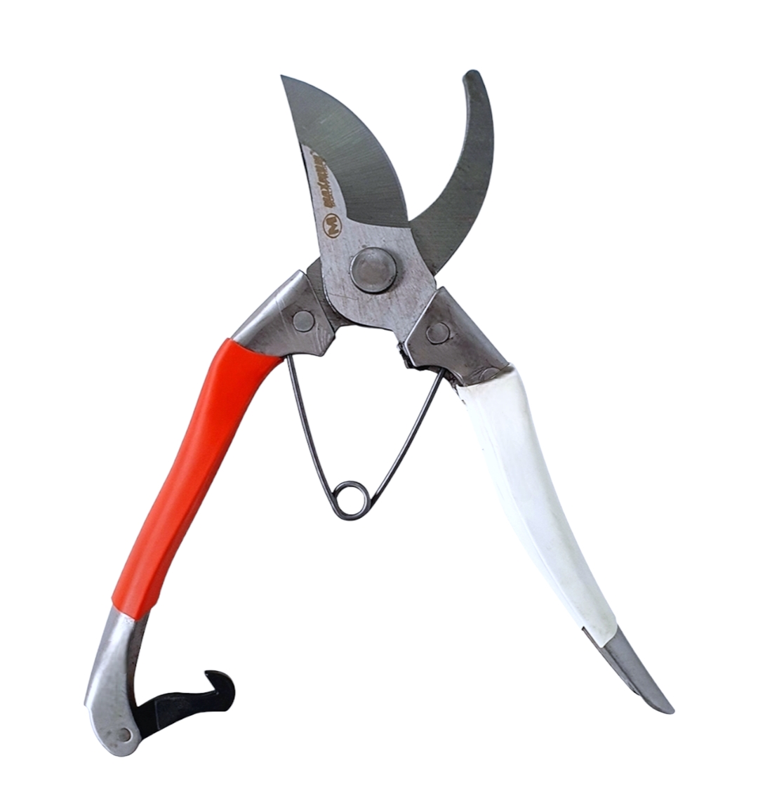 Секатор из стали SK5 с обливными нескользящими ПВХ рукоятками и возвратной пружиной, оборудован специальной блокировкой лезвий.